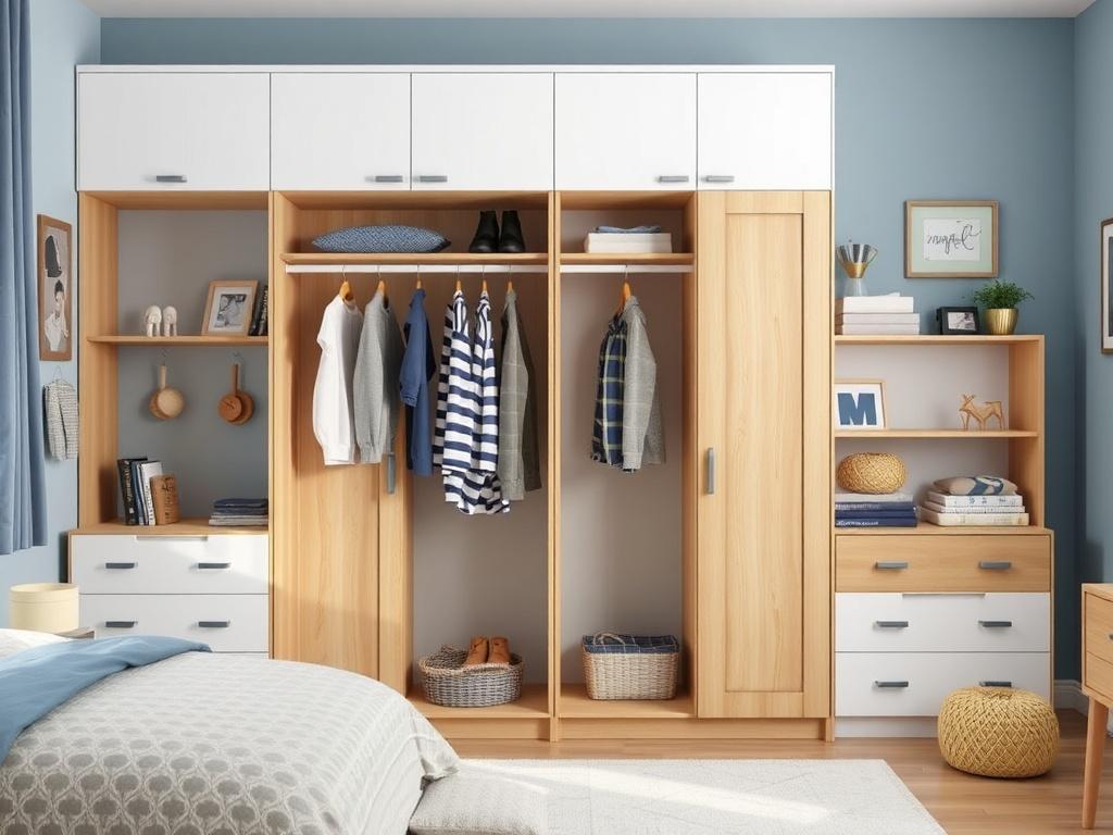 | Открытый гардероб | Легко видеть вещи, развивает аккуратность | Видны беспорядок и пыль | Для аккуратных детей и подростков |